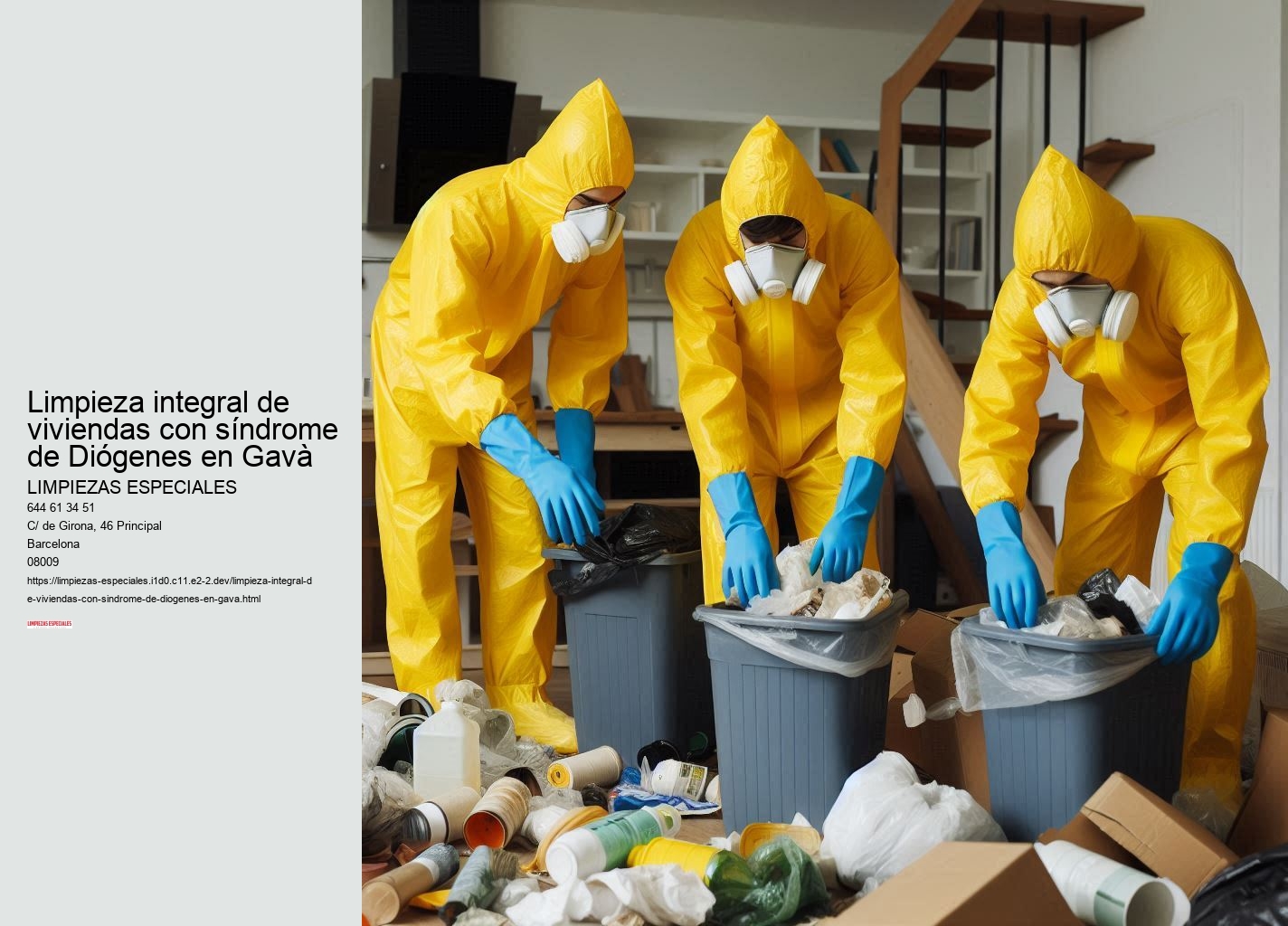 ¿Por qué esperar? Somos expertos Limpieza integral de viviendas con síndrome de Diógenes en Barcelona !Llama ahora¡. Contacte con nosotros hoy mismo y recupere la tranquilidad y seguridad de su hogar. Llame ahora para obtener un presupuesto gratuito y sin compromiso.Limpieza integral de viviendas con síndrome de Diógenes en Gavà - Eliminación de moho
