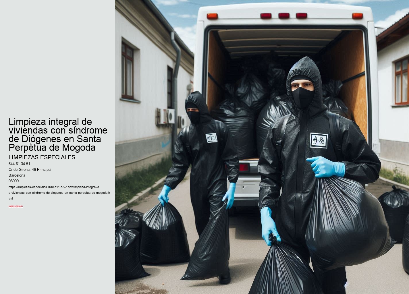 En Limpiezas Especiales Santa Perpètua de Mogoda, somos conscientes de la seriedad y complejidad del síndrome de Diógenes. Sabemos que lidiar con una acumulación extrema puede ser tanto abrumador como emocionalmente agotador. Nuestro objetivo es proporcionar la solución profesional y humana que necesita para restaurar la habitabilidad y seguridad de su hogar. Con una vasta experiencia y un equipo altamente capacitado, estamos preparados para enfrentar cualquier reto de limpieza, asegurando resultados excepcionales y una atención personalizada.