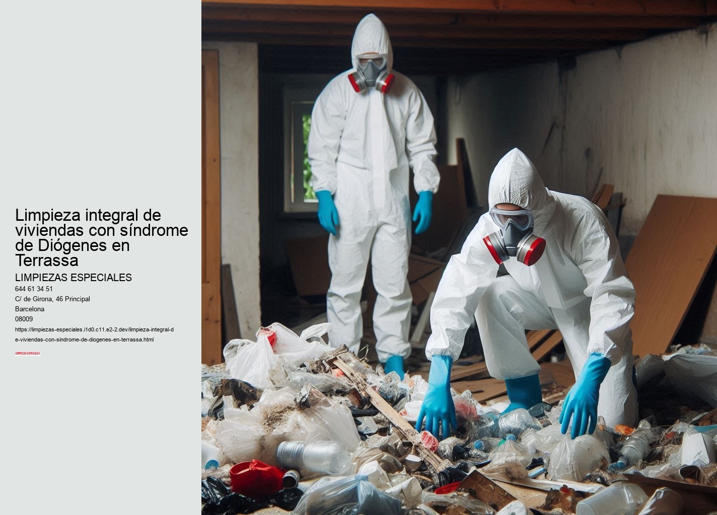En Limpiezas Especiales Terrassa, comprendemos la gravedad y complejidad del síndrome de Diógenes. Somos expertos Limpieza integral de viviendas con síndrome de Diógenes en Barcelona !Llama ahora¡. Sabemos que enfrentar una situación de acumulación extrema puede ser abrumador y emocionalmente agotador. Nuestro objetivo es ofrecer la solución profesional y humana que necesita para devolver la habitabilidad y seguridad a su hogar. Mejor opción para la Limpieza integral de viviendas con síndrome de Diógenes en Terrassa !LLAMA AHORA¡ Con años de experiencia y un equipo altamente capacitado, estamos preparados para abordar cualquier desafío de limpieza, garantizando resultados excepcionales y una atención personalizada.